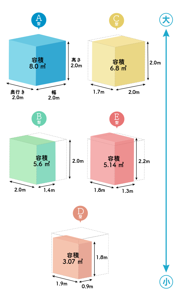 テツソーではA型~E型の5つのコンテナサイズをご用意しています。(外寸サイズ)